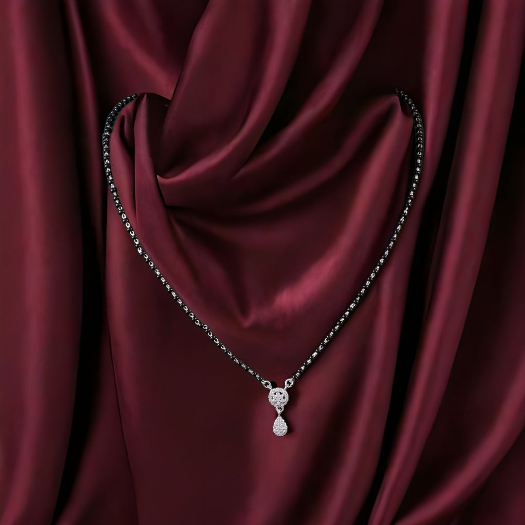 The NeerSutra is an exquisite 925 sterling silver mangalsutra that beautifully reimagines tradition for the contemporary bride. This handcrafted piece features a sparkling teardrop paired with a circular CZ-studded motif, symbolizing unity and eternity. Combined with traditional black beads, it creates the perfect balance of heritage and modern sophistication.