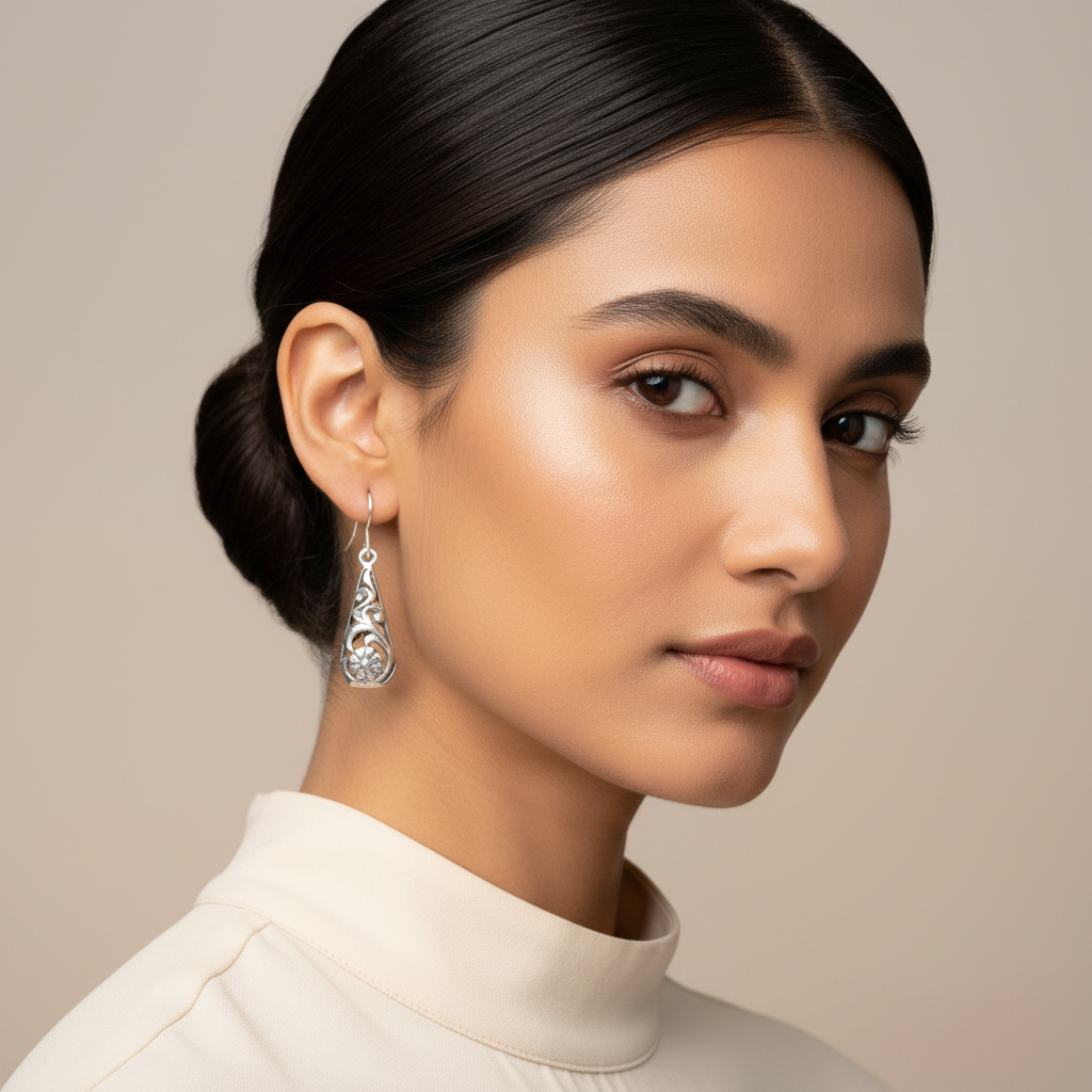 The Bloom Filigree Silver Drops are exquisite 925 sterling silver earrings that showcase the intricate beauty of traditional filigree craftsmanship. These handcrafted drop earrings feature delicate floral motifs with expert filigree work, creating a stunning blend of heritage artistry and contemporary elegance. Perfect for the modern woman who appreciates intricate detailing and timeless sophistication.