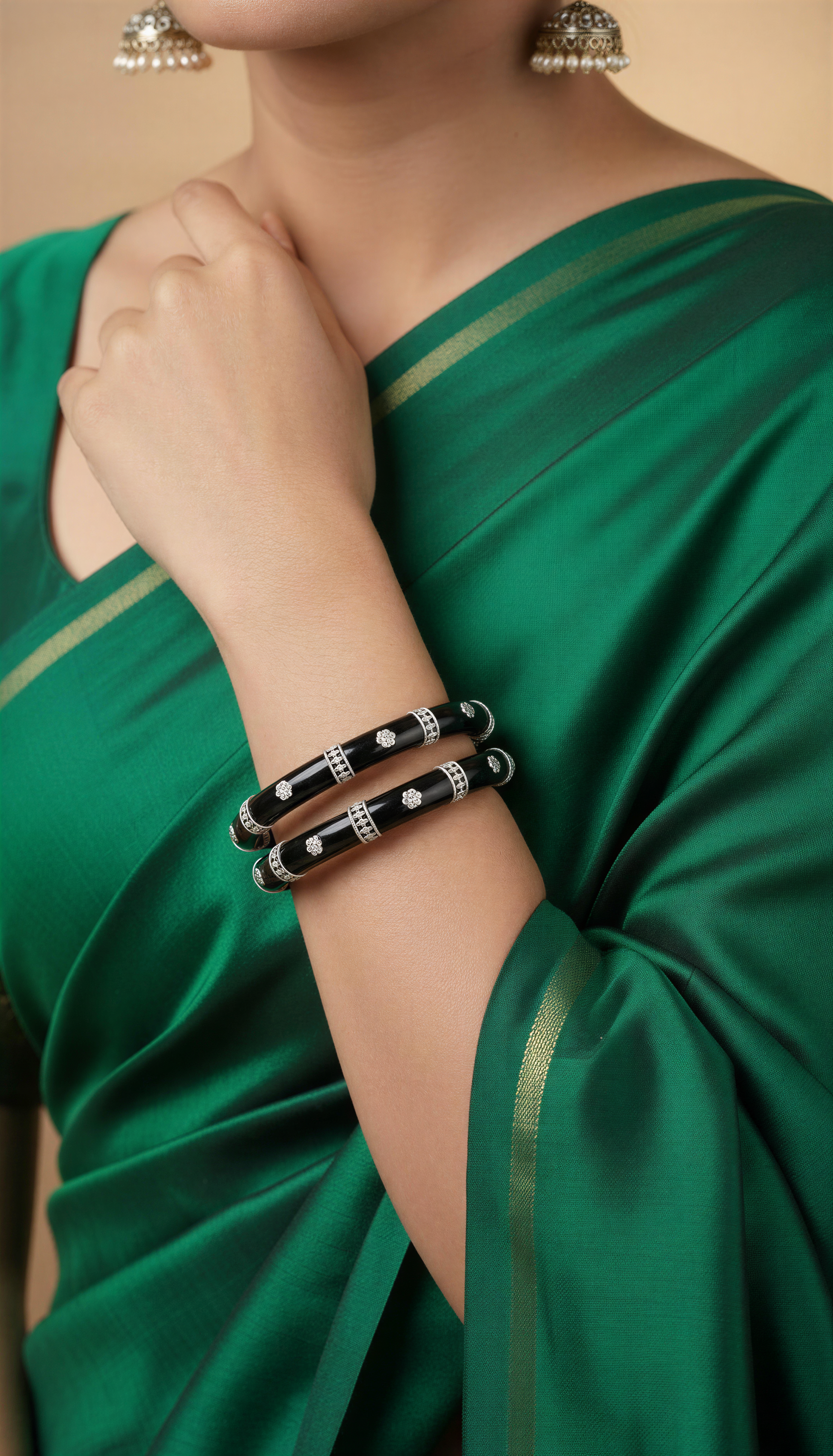 The Shyamoli Pola is a delicate 925 sterling silver bangle that embodies traditional Indian craftsmanship with contemporary grace. This handcrafted piece features a refined design that radiates timeless elegance, making it perfect for the modern woman who values both heritage and minimalist style.